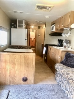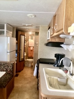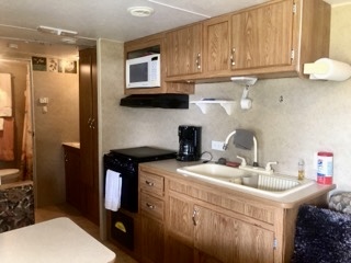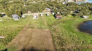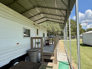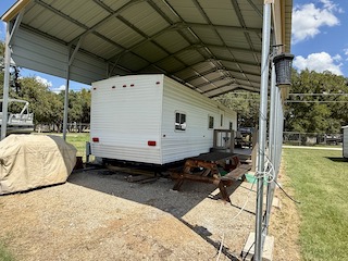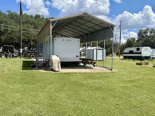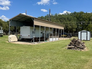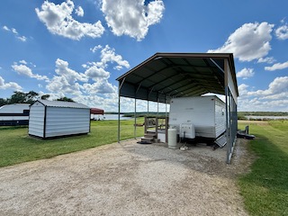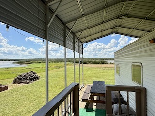 The property includes a large RV cover, an RV camper with a wooden deck, and grassy grounds that lead right to the water’s edge. The camper features a kitchen, bathroom, master bedroom, and dining area, with room to comfortably sleep up to six. Outside, enjoy a picnic table for gatherings and a small storage building—perfect for camping gear, lawn equipment, or fishing supplies.
