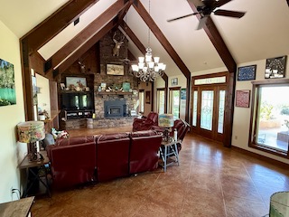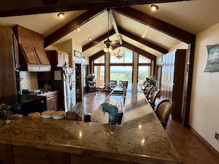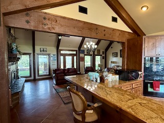 Crafted from native stone with a composition roof and expansive wraparound porch, the home features high-end finishes throughout. Upon entry, you’re welcomed into a grand great room with soaring cathedral ceilings, a large stone fireplace, and an open-concept layout that flows seamlessly into the kitchen and dining areas. The gourmet kitchen boasts granite countertops, an eat-in bar, stainless steel appliances, a commercial-grade gas cooktop, and a generous dining space—all with breathtaking views from every window.