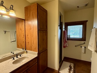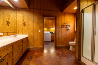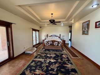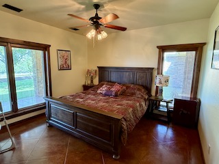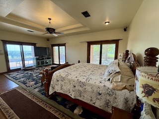 The spacious master suite features three sliding glass doors leading out to the porch and hot tub area. The luxurious ensuite bath includes a jacuzzi tub, double sinks, and a large walk-in closet. On the opposite side of the home, two additional bedrooms share a full bathroom, offering privacy for guests or family. A large executive office—makes working from home both functional and scenic. The laundry room is thoughtfully designed with a sink, butler’s pantry, and direct access to a glass-enclosed sunroom.