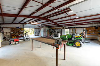 A 2,000 sq. ft. insulated metal shop includes two roll-up doors, two walk-in doors, a large workbench, and a water storage tank. Nearby, the well house features batted insulation, a concrete floor, heat lamp, and two covered dog kennels with chain-link fencing.