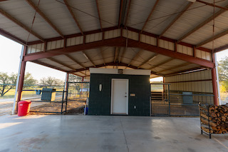 The metal-construction barndo offers a full kitchen, laundry room, vaulted ceilings, wood-burning stove, and a large bedroom with ensuite bath. Attached is covered parking for two vehicles, an RV bay, four stalls, and a 19x10 tack room—ideal for guests or ranch help.