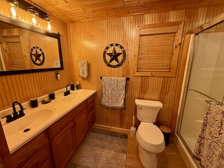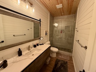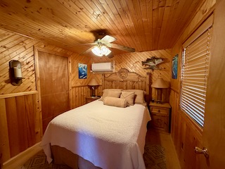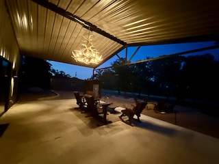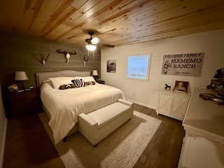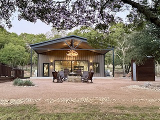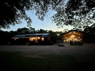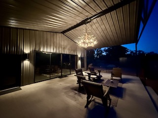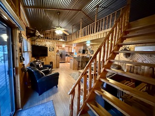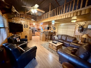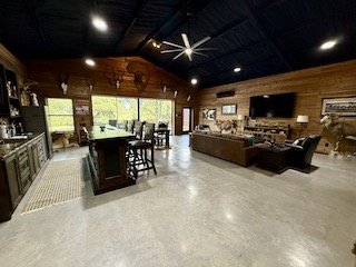 Lodge (Built 2024): 2,050 sq. ft. under roof with 1,400 sq. ft. heated and cooled. Includes 2 bedrooms, 1 bath, a spacious gathering room with full bar, granite countertops, TVs, and large sliding doors that open to a 30x30 covered porch, creating a seamless indoor-outdoor living experience.