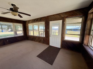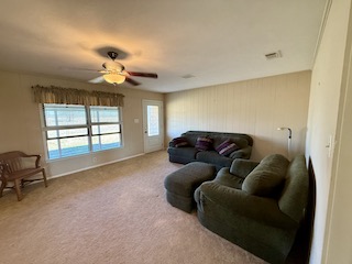 The home features carpet and laminate flooring, large windows providing abundant natural light, and a durable metal roof.