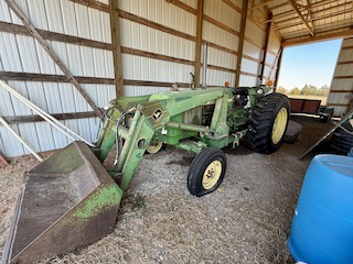 • Older John Deere tractor with front-end loader and shredder